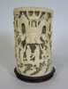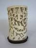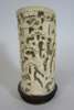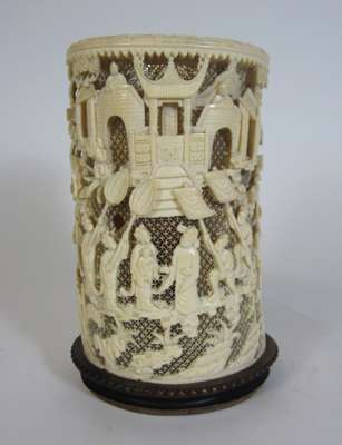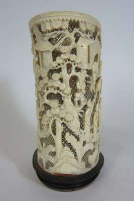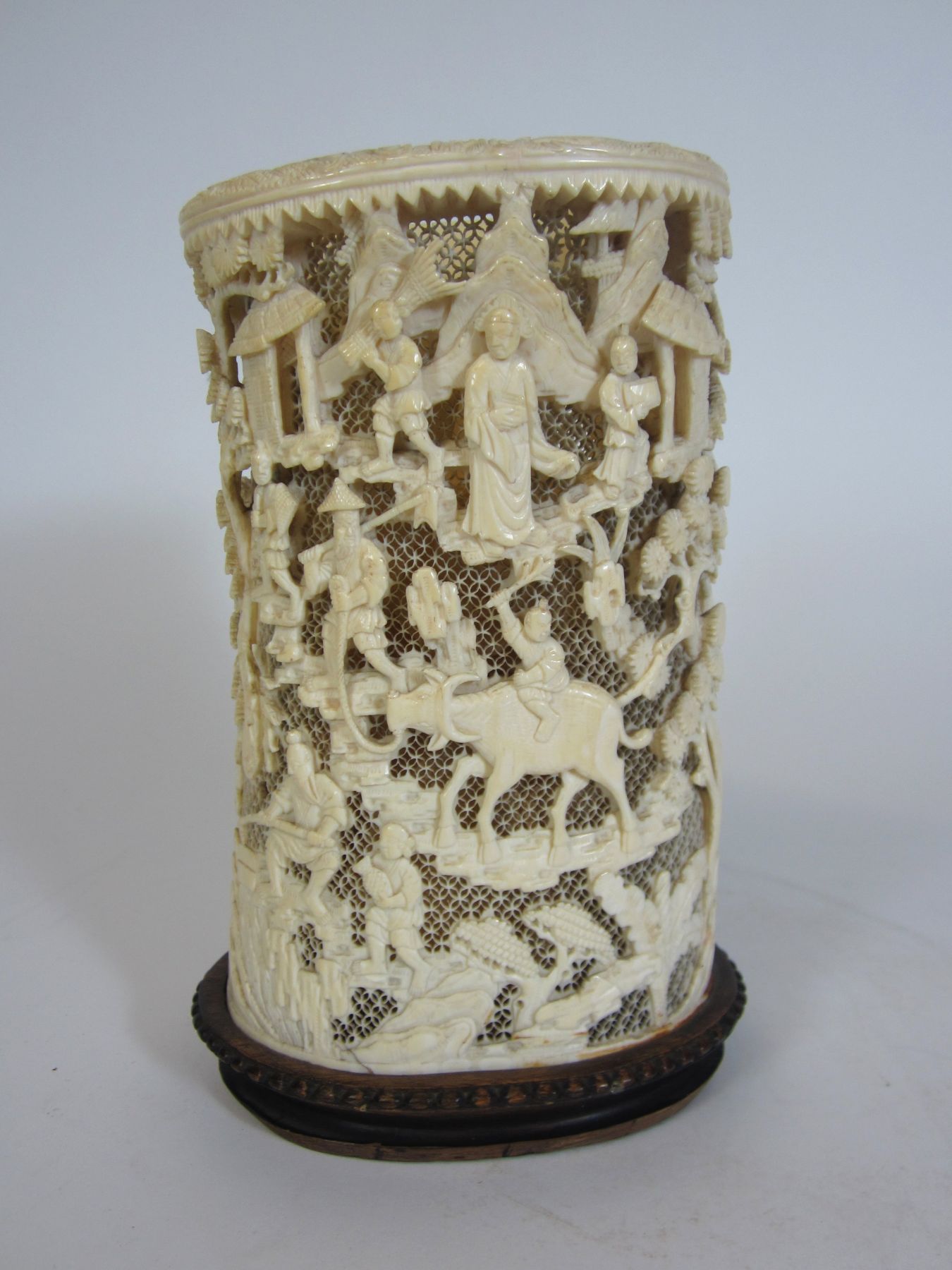 the ornate pierced sides carved in high relief with figures, pagoda, mountains and peony and scrolling foliage