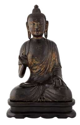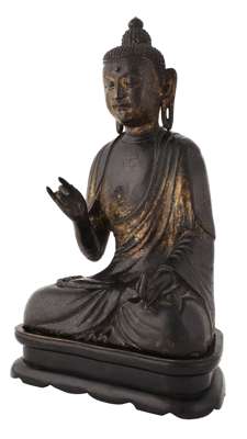 in dhyanasana, wearing a long flowing robe with a serene expression and tightly curled hair, raised on a wood stand