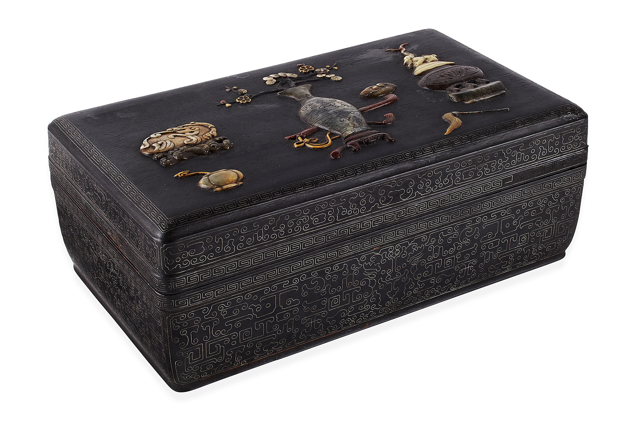CHINESE ZITAN WOOD, SILVER INLAID AND HARDSTONE BOX