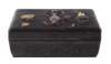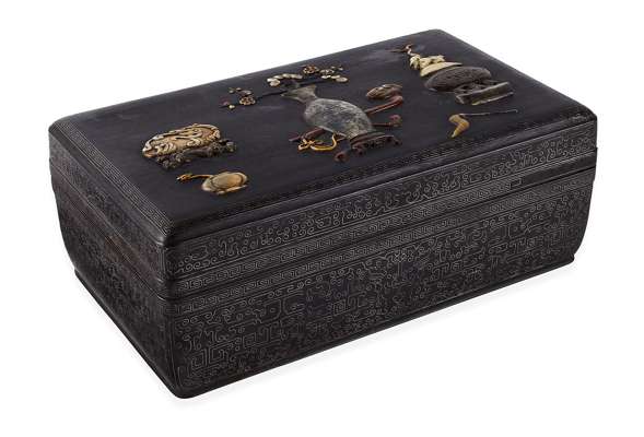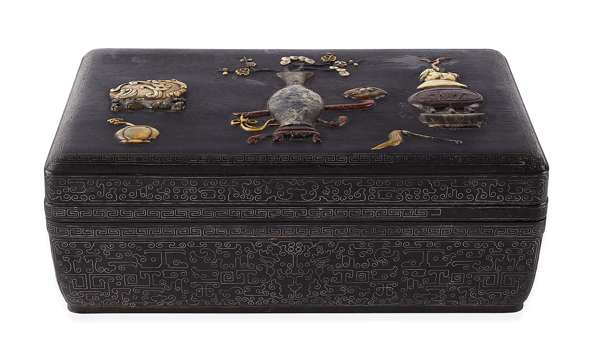 of rectangular form, the cover inlaid with a flowering vase and other vessels, the sides inlaid throughout with wire scrolls, four character mark