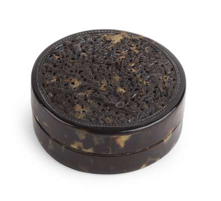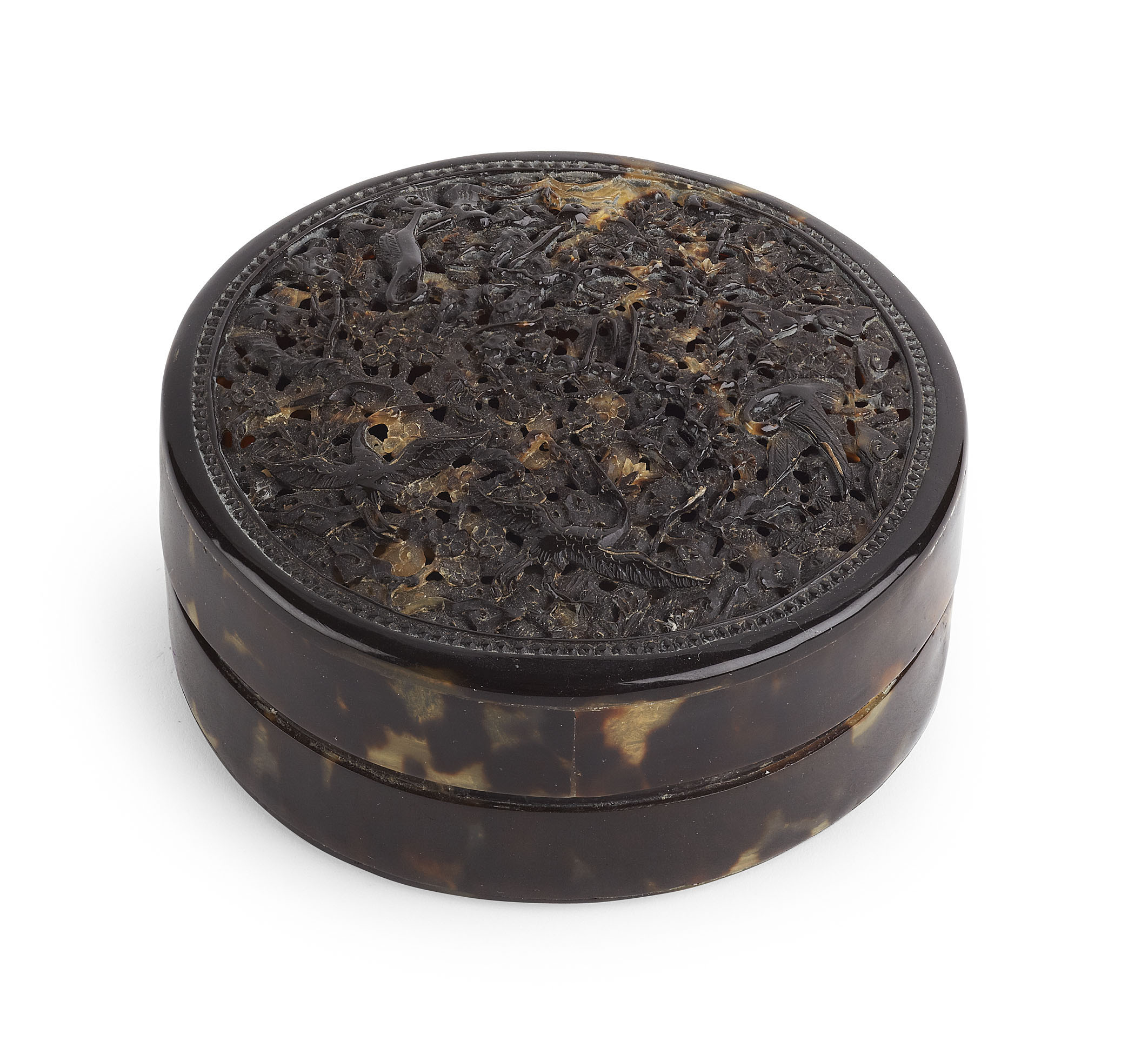 the circular box with a pierced cover finely carved with scrolling foliage and cranes