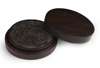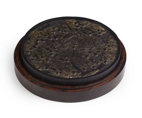 the circular stone carved in relief to both sides with an allover scene of boys engaged in various pursuits in a garden with traces of gilt decoration, in a conforming hardwood box