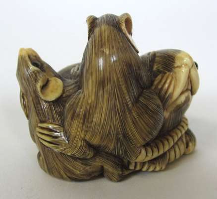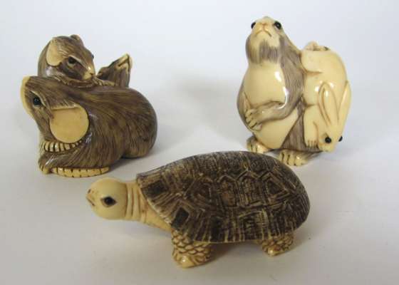 carved as a family of rats, signed 4.5cm long; a SIMILAR NETSUKE carved as two rabbits, 4.5cm long; and a SIMILAR NETSUKE as a tortoise, 6cm long (3)