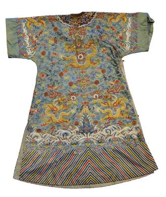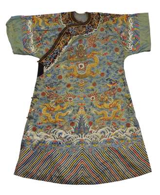 embroidered in gold and polychrome, with five-claw dragons chasing flaming jewels amongst clouds, bats and stylised symbols