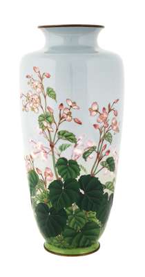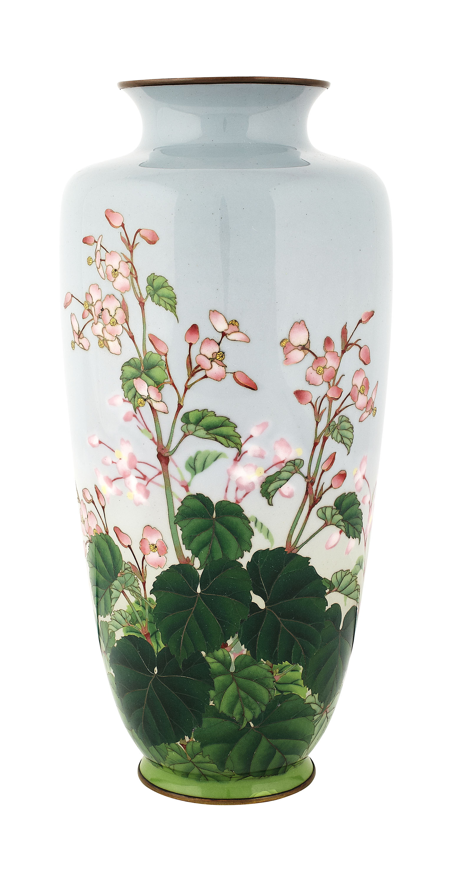 mark of Gonda Hirosuke Studio, worked in wired and wireless enamels with blossoming branches and leaves on a blue ground, stamped mark
