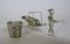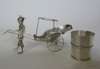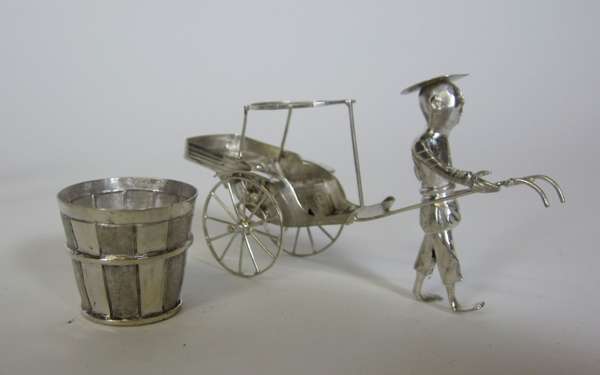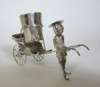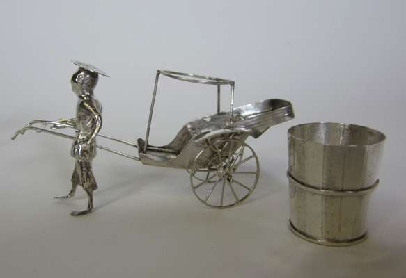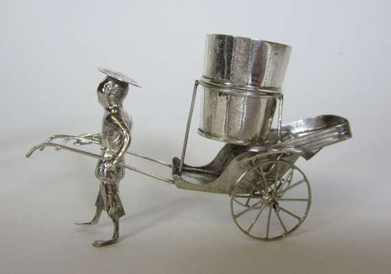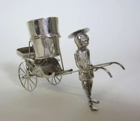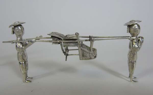marked KL, character mark, in form of a sedan chair held by two bearers, pierced decoration to chair and engraving to figures; together with a MATCHED PAIR OF NOVELTY SALT CRUETS, character mark, in form of a mobile rickshaw pulled by driver with engraving to figure, rickshaw and barrel (3)