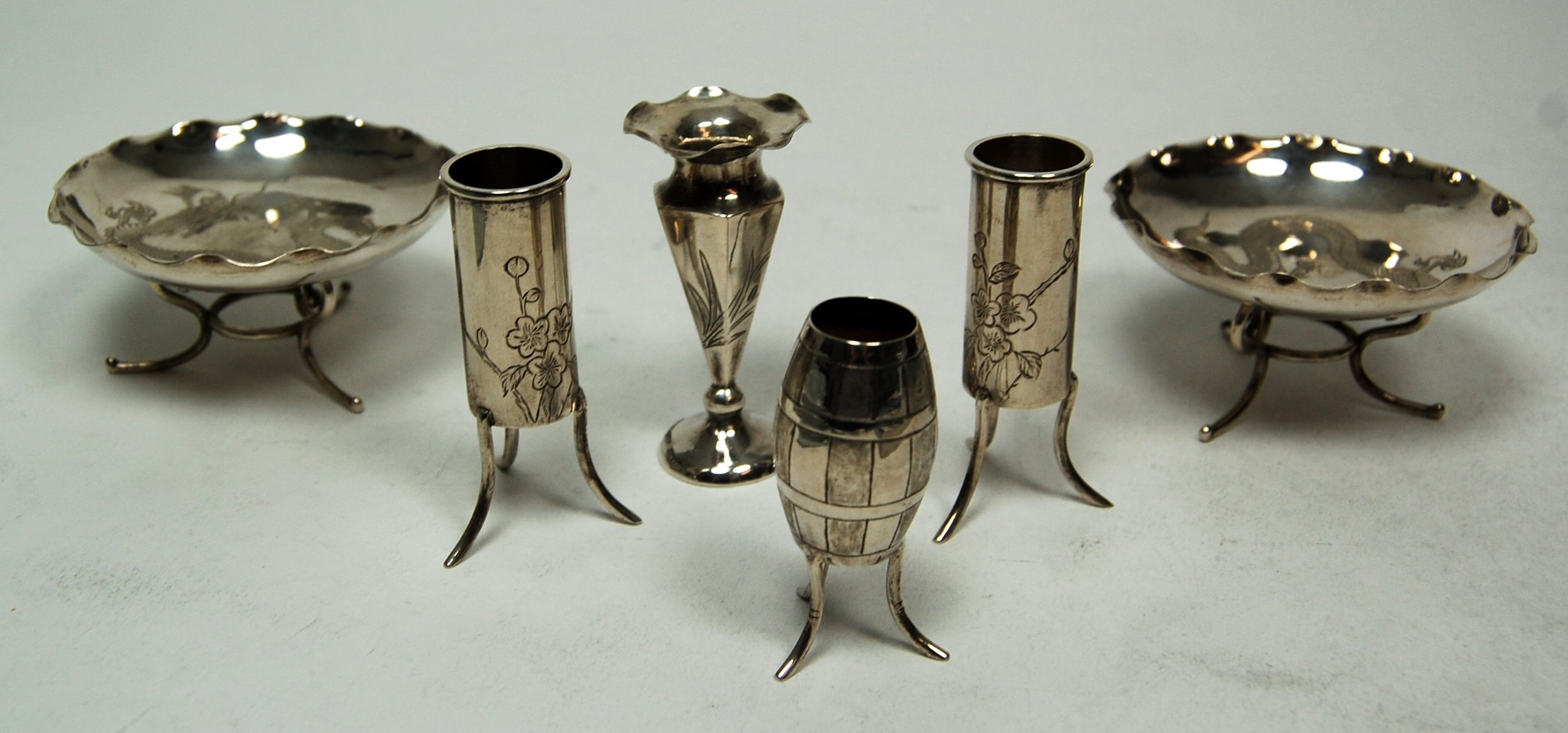 marked KH, character mark, of shallow form with scalloped circular dish engraved with running dragoon, raised on simple wire work frame supports; together with a miniature Chinese export spill vase and three toothpick holders, various makers (5)