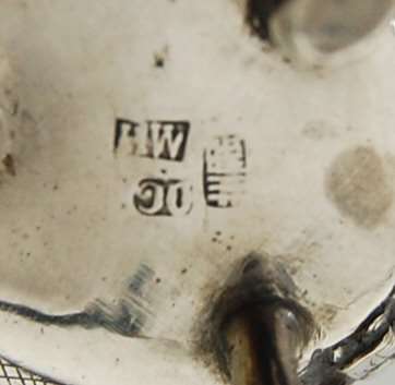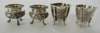 a pair marked WH, 90, character mark, of cauldron form with baluster body on three dragon feet, with chased decoration of a traditional Chinese scene, with clear glass liner; a pair of salts of quatrefoil form, the panels decorated with foliage, on four bamboo legs (4)