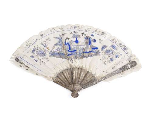 CHINESE SILVER FILIGREE AND PAINTED FEATHER FAN