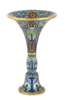 the flaring neck decorated in brightly coloured enamels with panels of stylised motifs and scrolling foliage, raised on a bell shaped foot