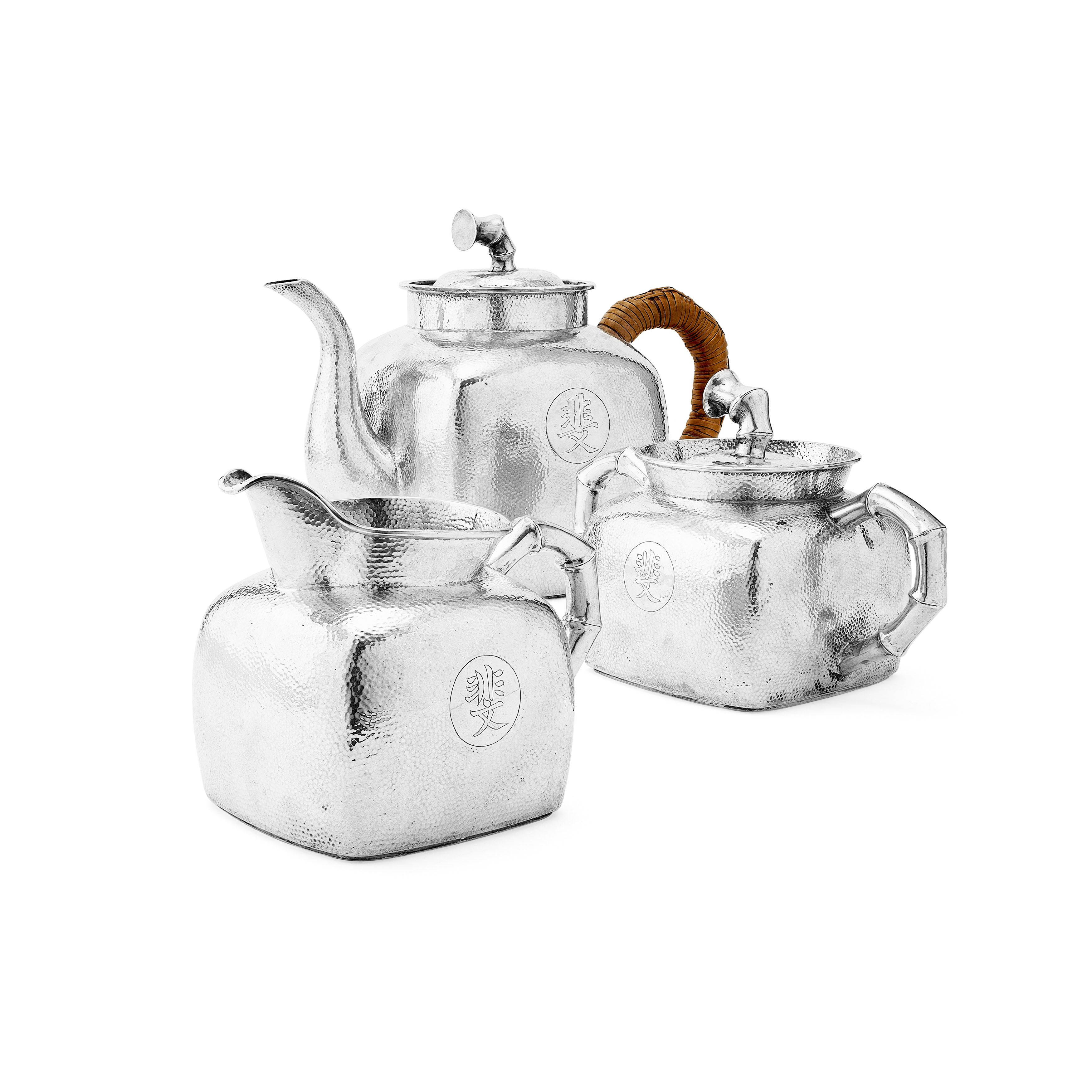 marked with character mark to base, comprising a teapot, covered twin handled sugar bowl and milk jug, each of square section with planished finials and a circular cartouche inscribed with characters, the handles naturalistically formed as bamboo (3)