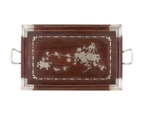 CHINESE SILVER INLAY AND ROSEWOOD TRAY