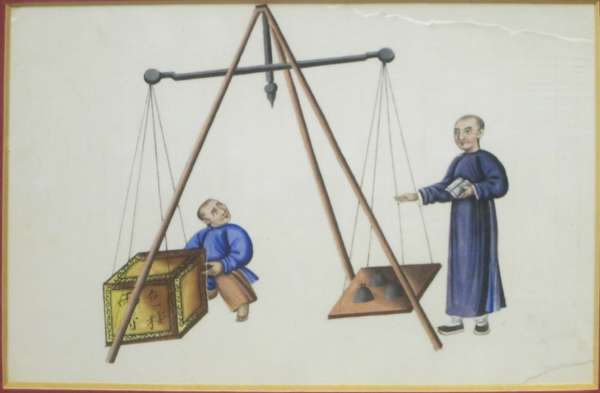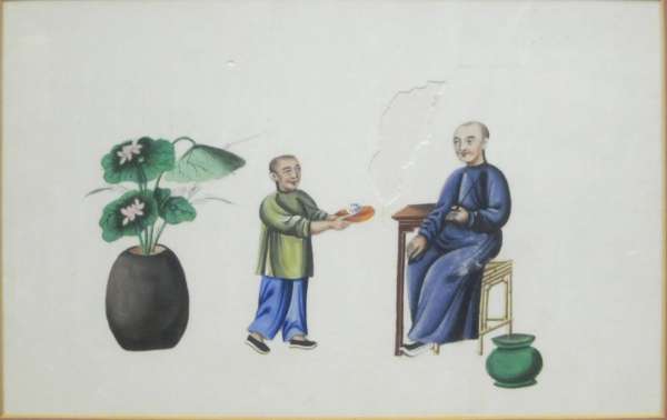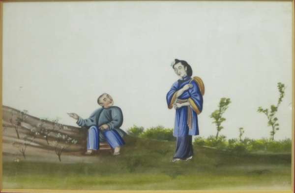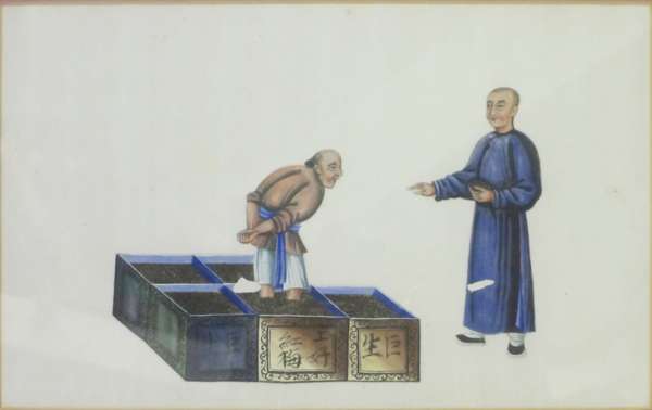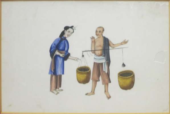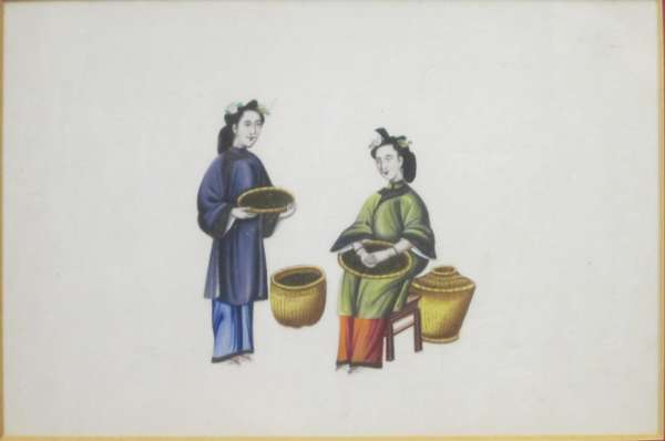 each with a polychrome painted scene of stages of tea production and trade, framed (7)