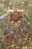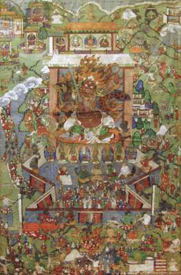 the two-armed central figure holding a sword and wearing a crown with five skulls, standing on prostrate figures against a field filled with buddhistic symbols, mythical beasts, animals and demons, set in a stitched silk border, framed