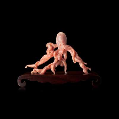 CHINESE CARVED ANGEL SKIN CORAL FIGURE OF AN OCTOPUS