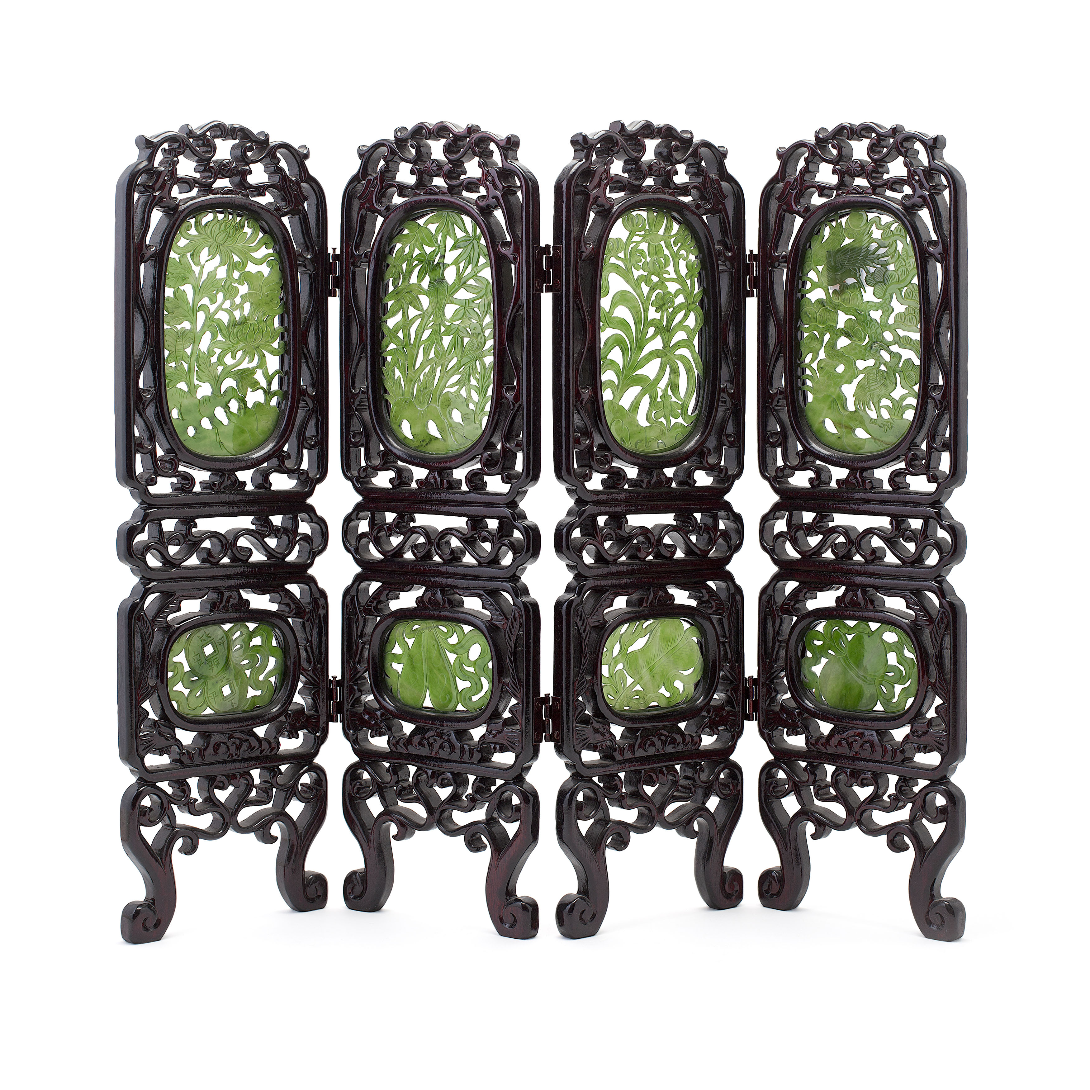 each panel set with two oval pierced green jade panels, carved with foliage, auspicious items, exotic birds and fruit