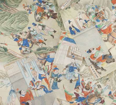 Various sizes, mostly cut down, unframed, depicting court scenes, warriors, and figures in gardens with calligraphic inscriptions and seal marks (qty)