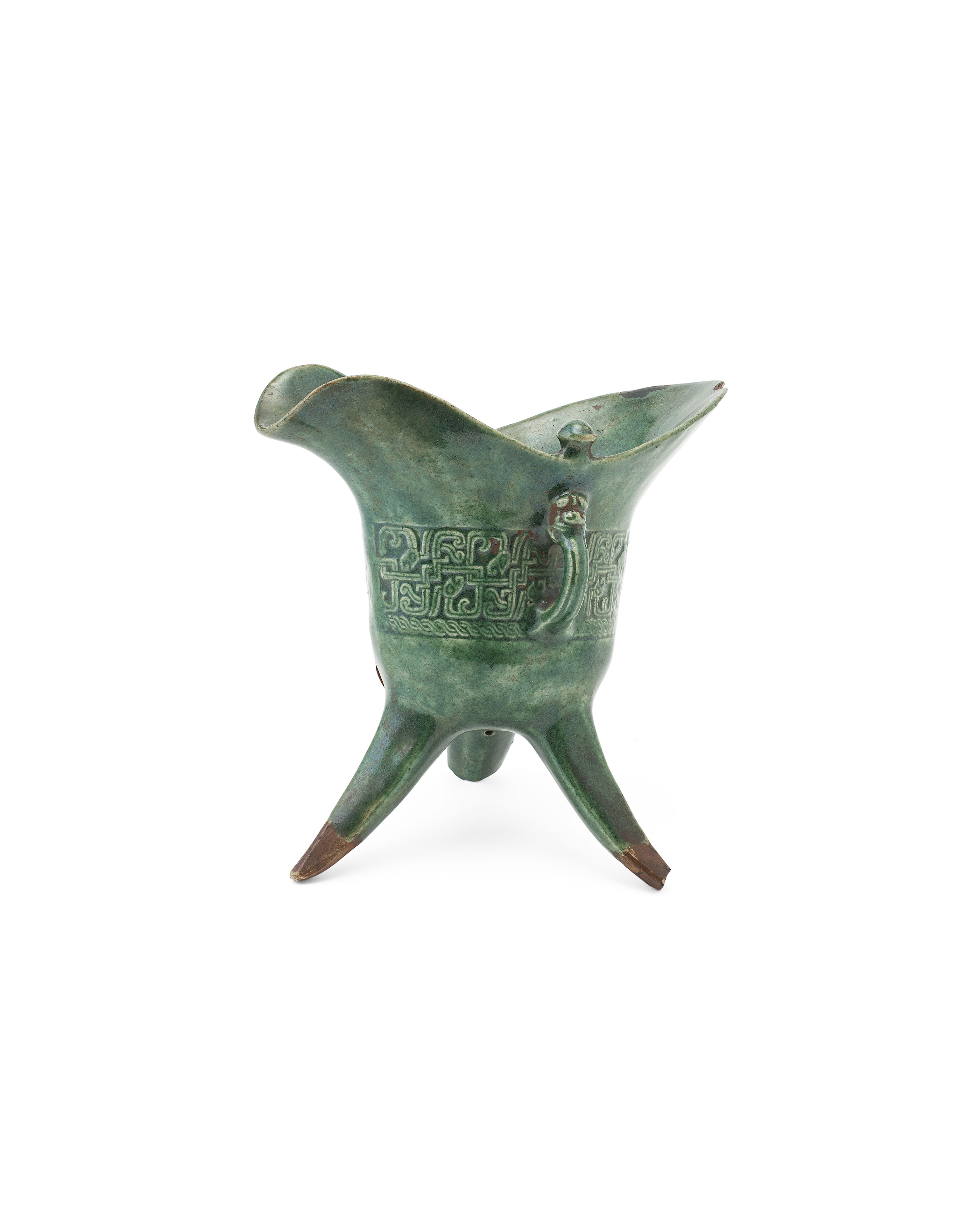 the U-shaped body with a long spout and decorated with a wide band of stylised scolls, on three blade form legs