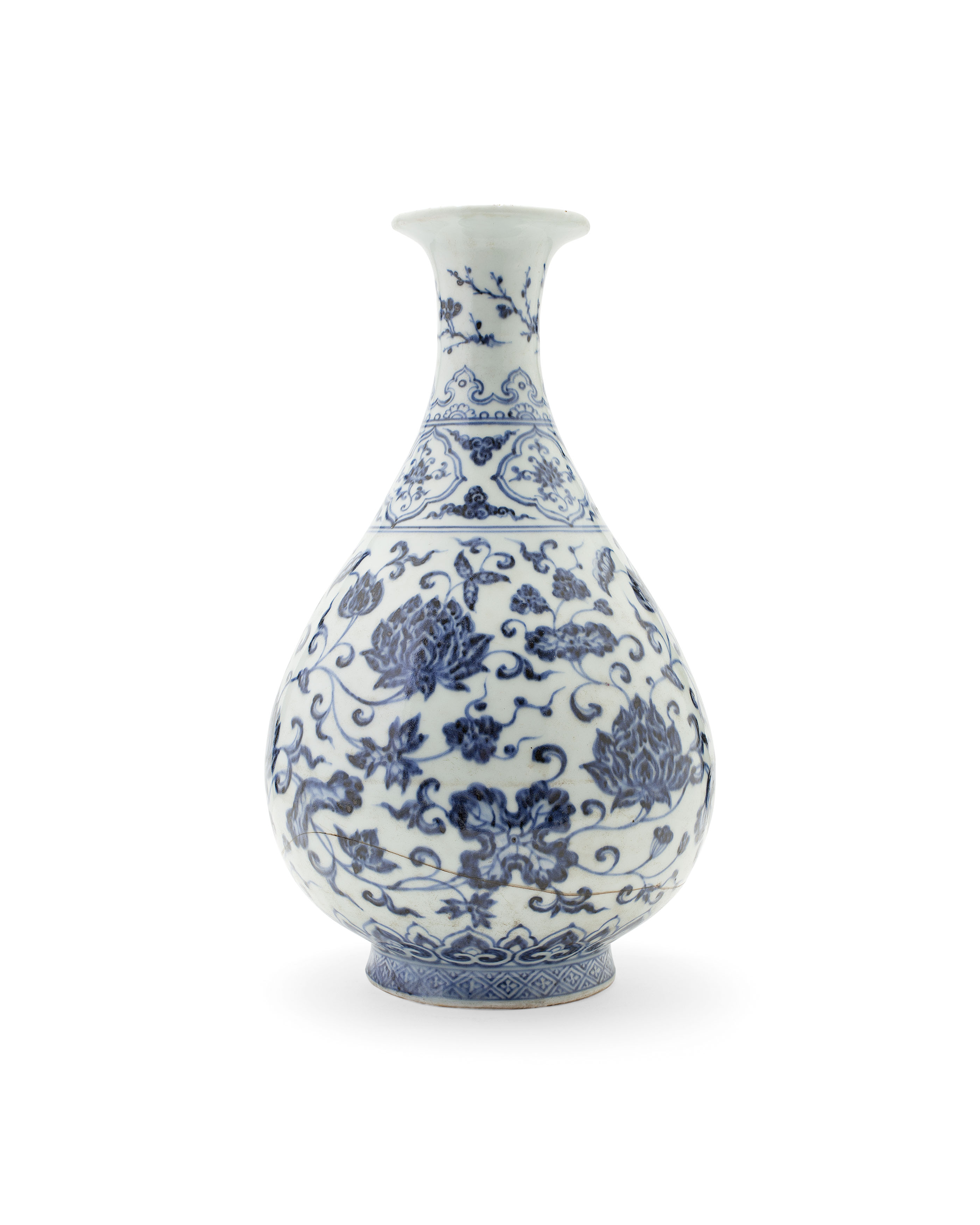 the flared mouth over a slender neck with bands of prunus and lotus lozenges, the body with lotus and scrolling foliate above a lappet band and diaper pattern foot, unmarked