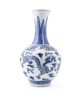 the slender neck with rising plaintain leaves over a band with coin reserves, the body painted with two scrolling dragons against a cloud filled ground, four character mark to the base