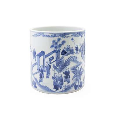 CHINESE BLUE AND WHITE 'HUNDRED BOYS' BRUSH POT