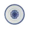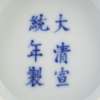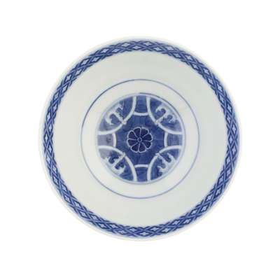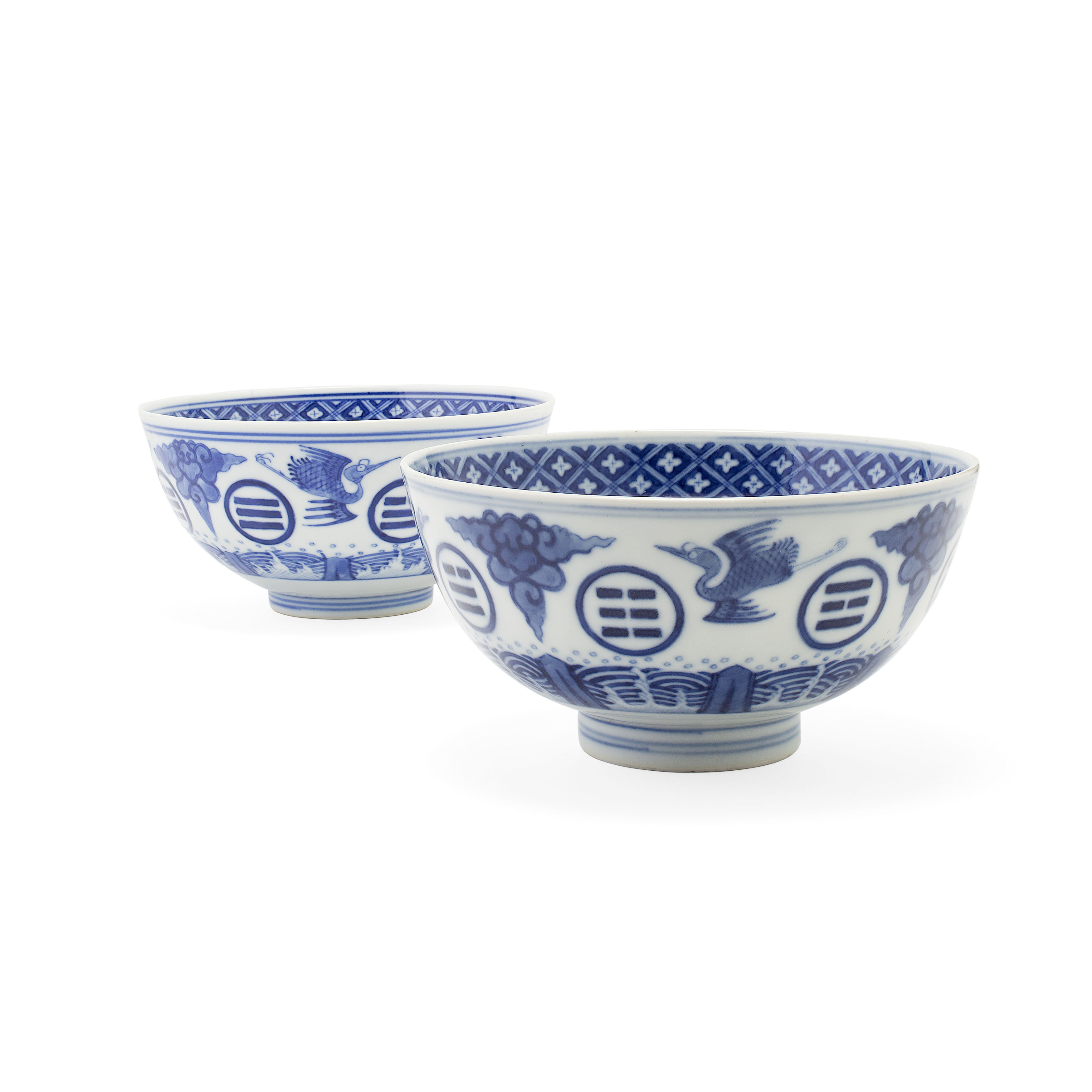 the interior painted with a diaper border and centred by waves and lotus blossom, the exterior painted with clouds, coins, and cranes, blue six character mark (2)