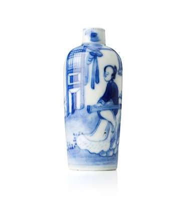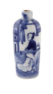depicting mothers and children in a garden, four character script mark in blue enamels, 5cm; and a CHINESE BLUE AND WHITE SNUFF BOTTLE painted with a maiden in a garden, with Gow Collection label, 7cm high (2)