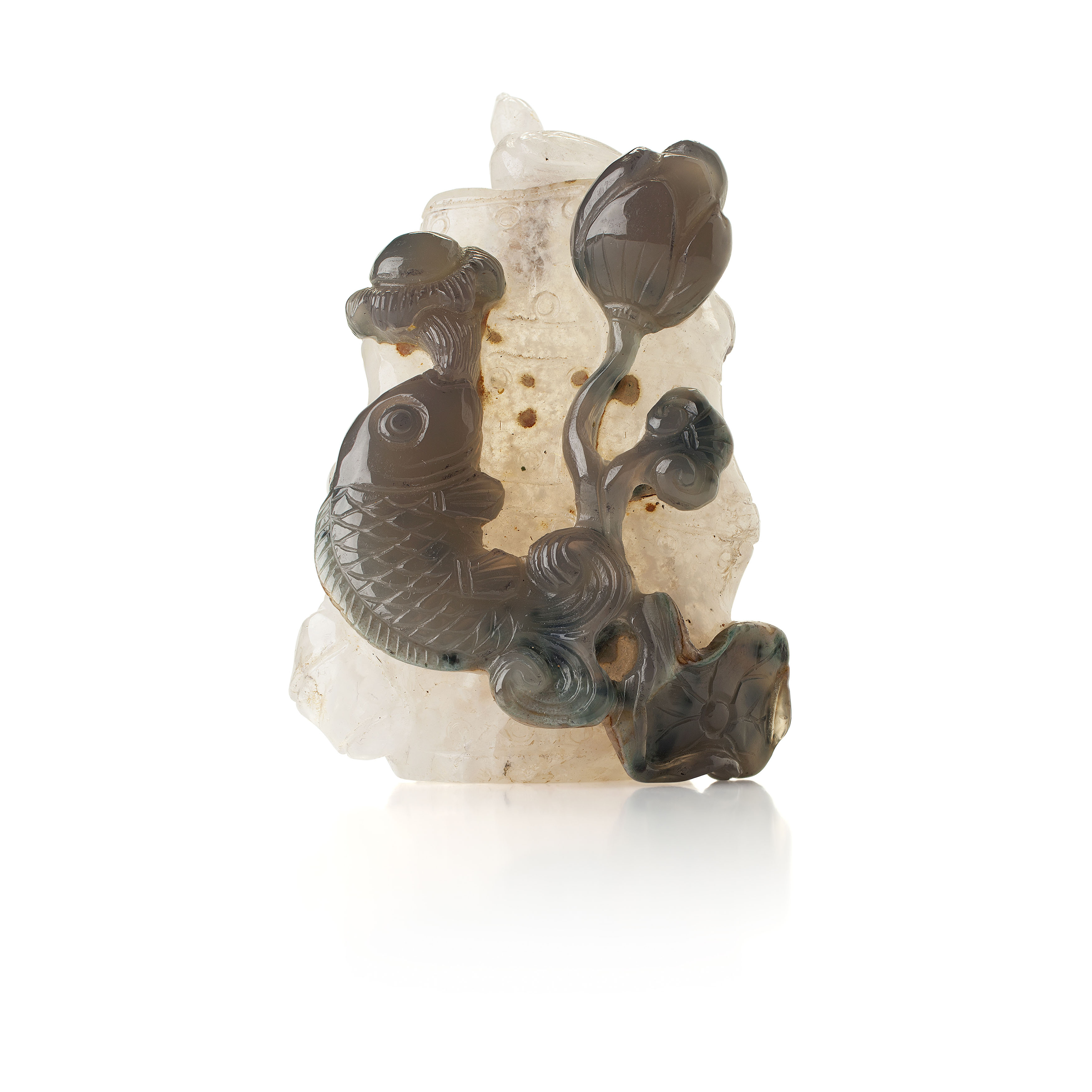 naturalistically carved with fish and flowers, the stopper modelled as a duck