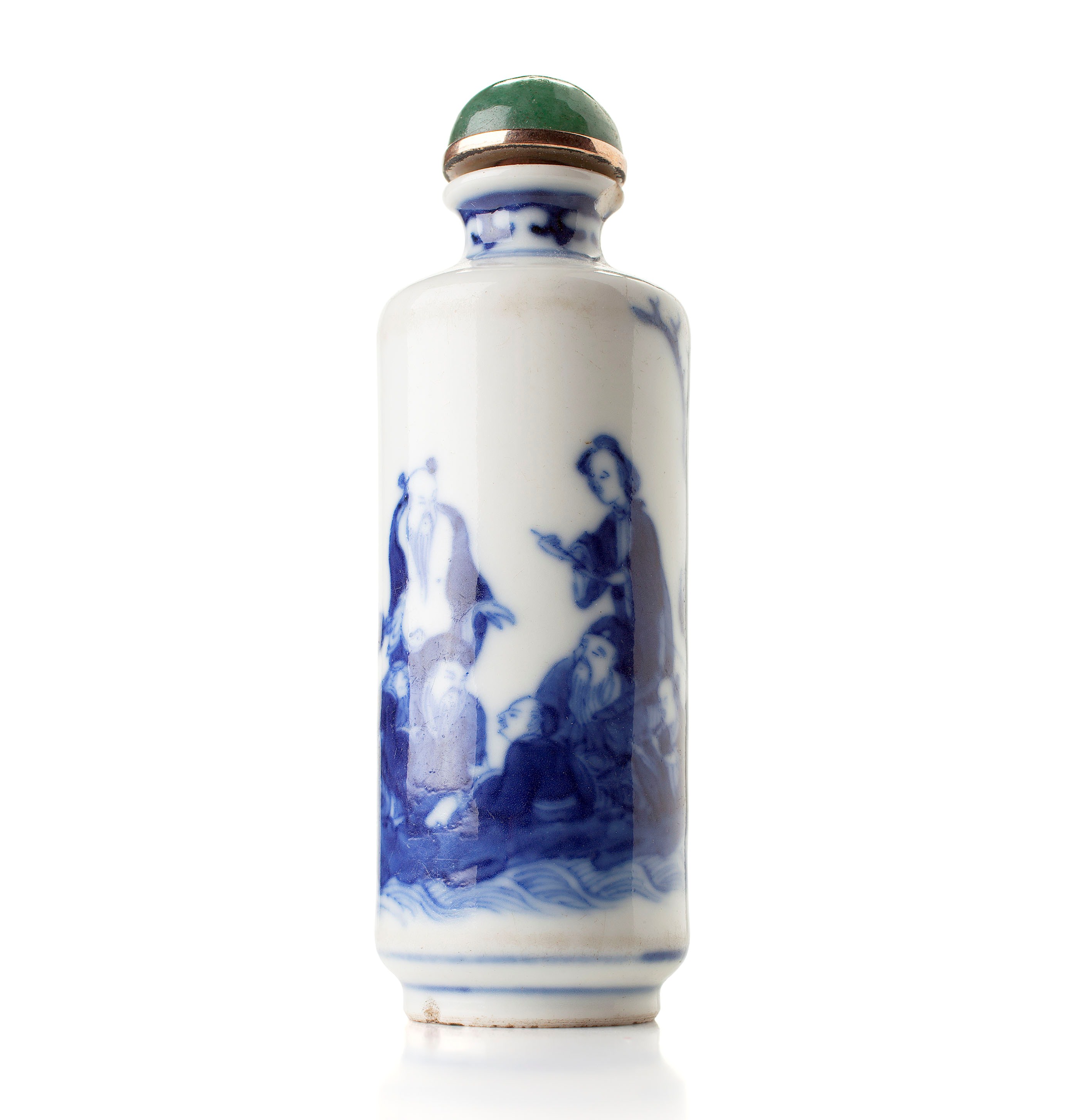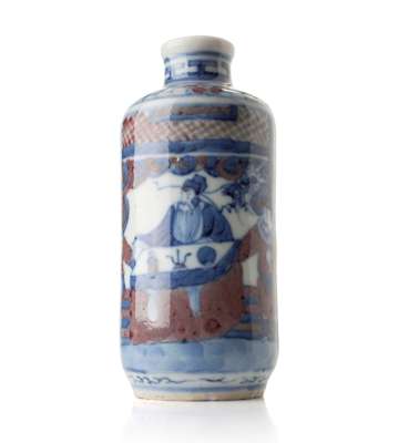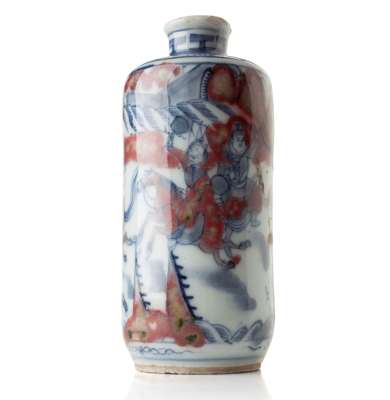 all of cylindrical form; one with underglaze blue figures in an exterior scene and jade stopper, seal mark to base; two with underglaze blue and iron red decoration depicting figures in traditional scenes, one with underglaze blue six character mark; the final one with an iron red dragon and flaming pearl, four character mark to base (4)
