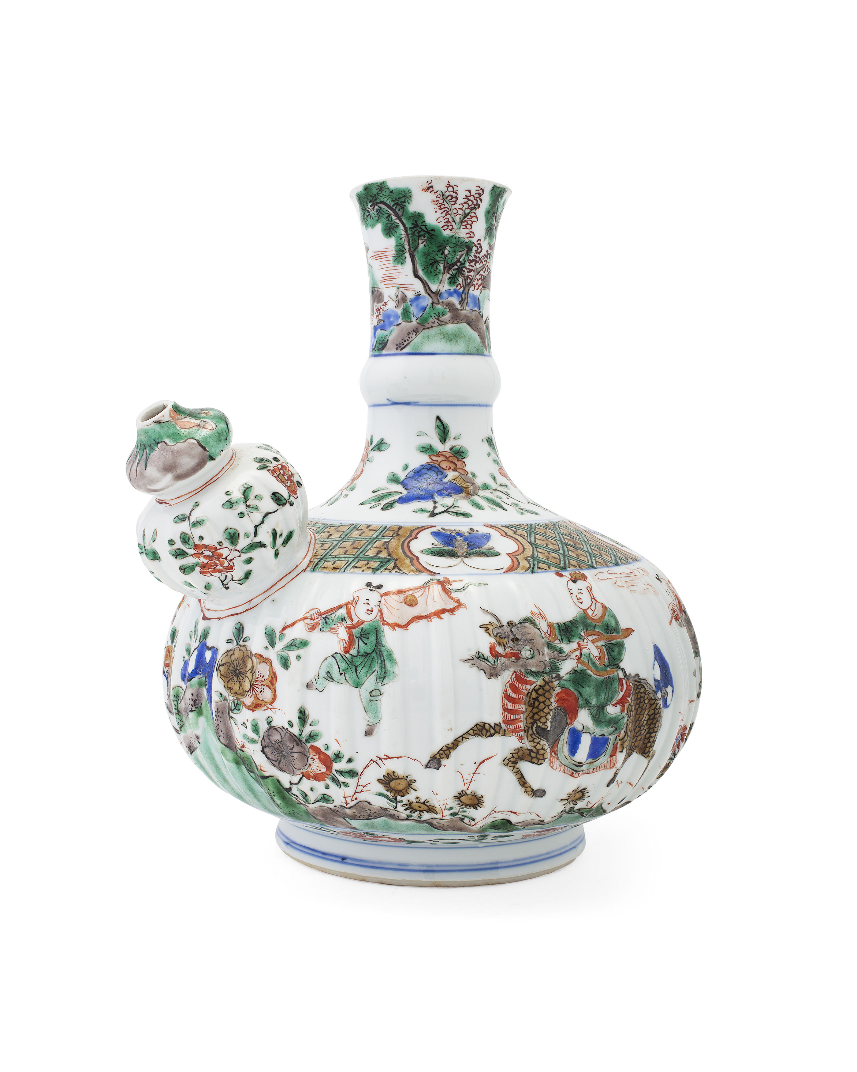 painted with a figure mounted on a qilin, accompanied by fan-bearing attendants, the shoulder decorated with diaper pattern and butterfly reserves, the spout and neck ground down with sprays of flowers and a landscape scene, framed by lines in underglaze blue and iron red