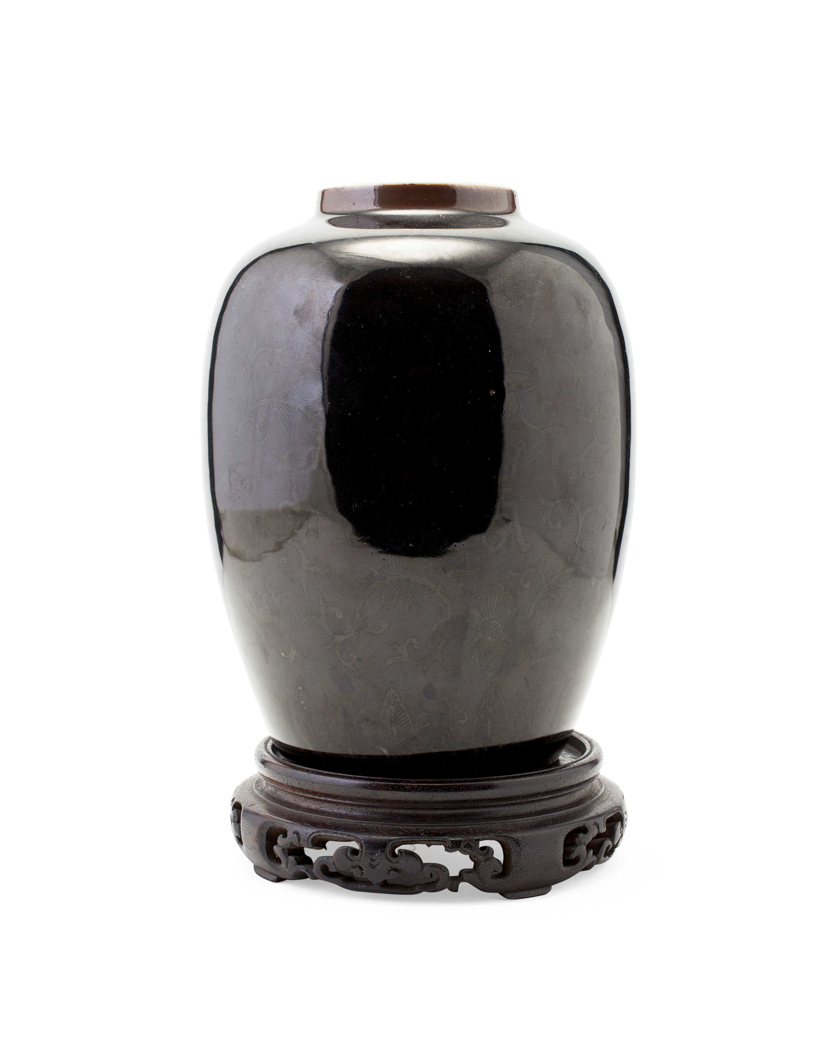the ovoid sides with traces of gilt decoration, six character mark to the base, on a hardwood stand