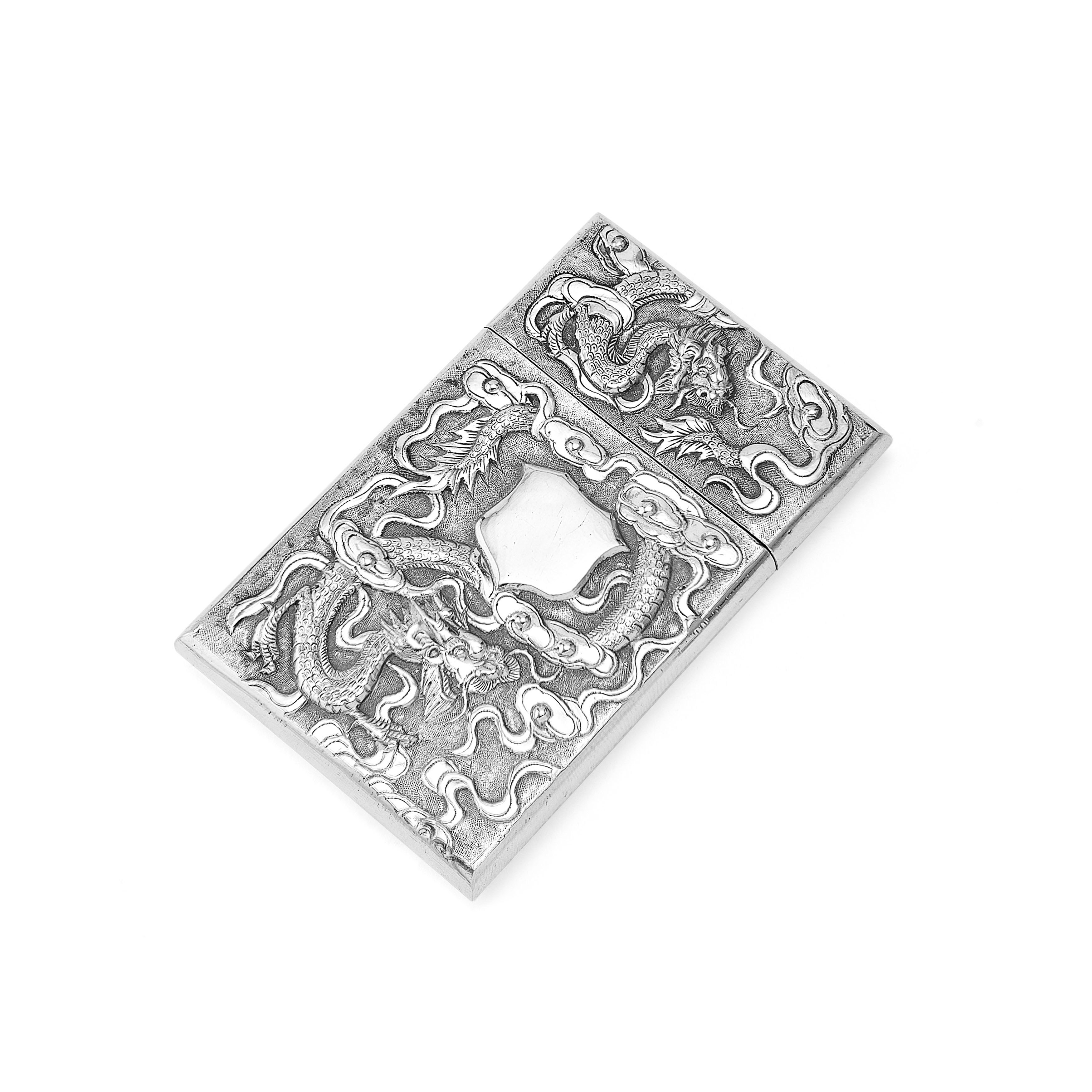 or rectangular form with a removable cover, decorated in relief with intertwined dragons and a vacant shield cartouche, the reverse with a pagoda surrounded by bamboo