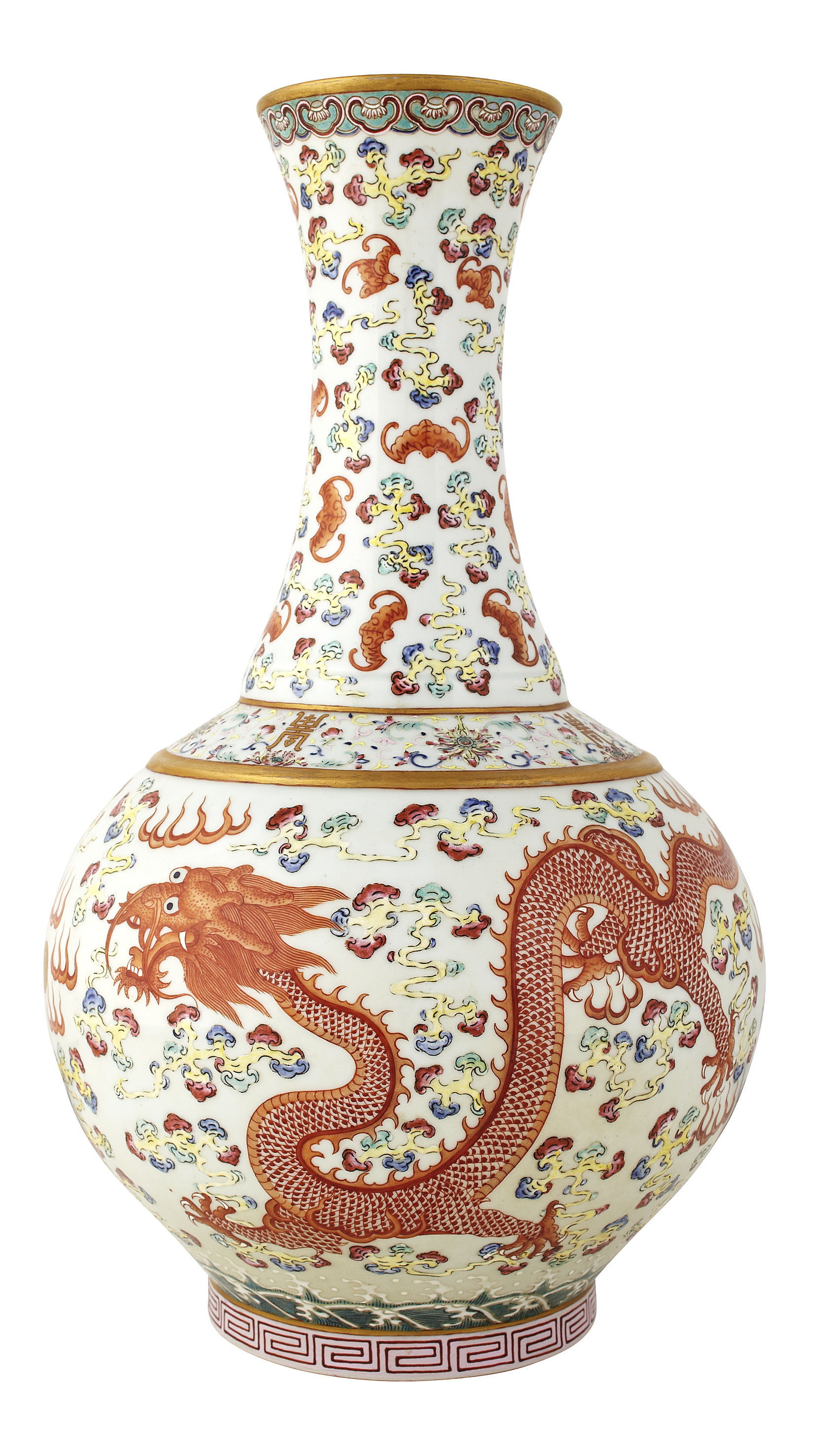 the slender neck and sides painted with bats and clouds and a five clawed dragon, enriched with gilt
