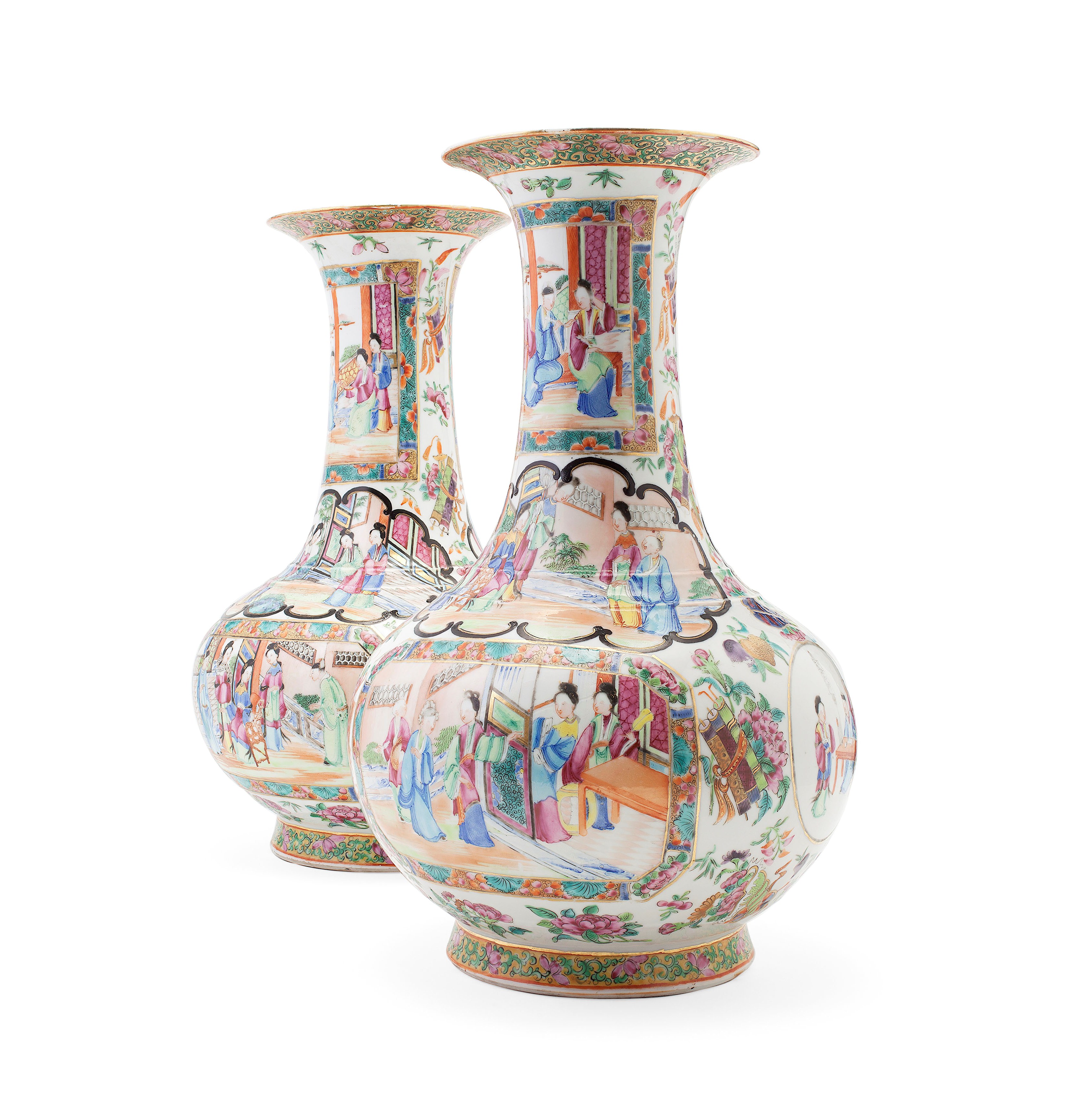 PAIR OF CHINESE CANTON FAMILLE ROSE BOTTLE VASES