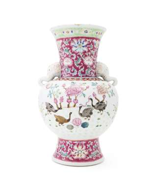 with flaring neck and elephant mask handles, the body decorated with geese in a flowering garden of peony, iris and other plants, the shoulder with a band of ruyi heads, the neck richly decorated with scrolling flowers on a ruby red ground, iron red four character mark to the base