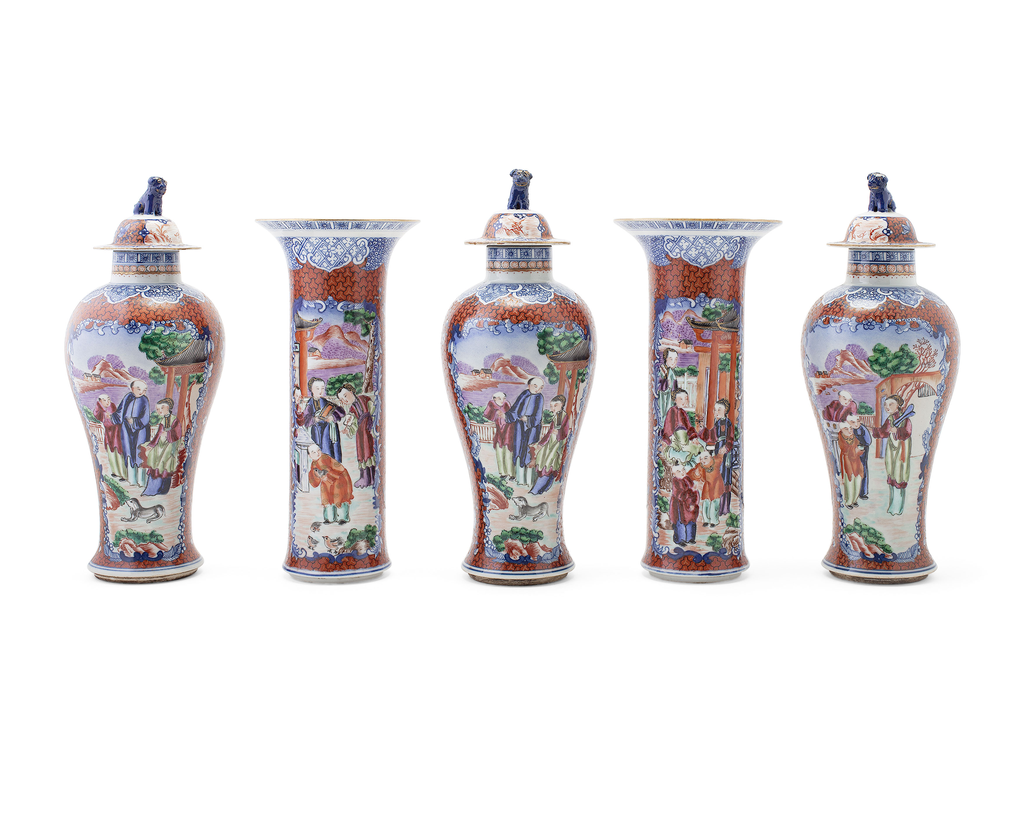 comprising three baluster vases and two beaker vases, painted with palace scenes within reserves, bordered in underglaze blue on an iron red beehive diaper ground, the neck with cloud band collar, the covers with animal finials (5)