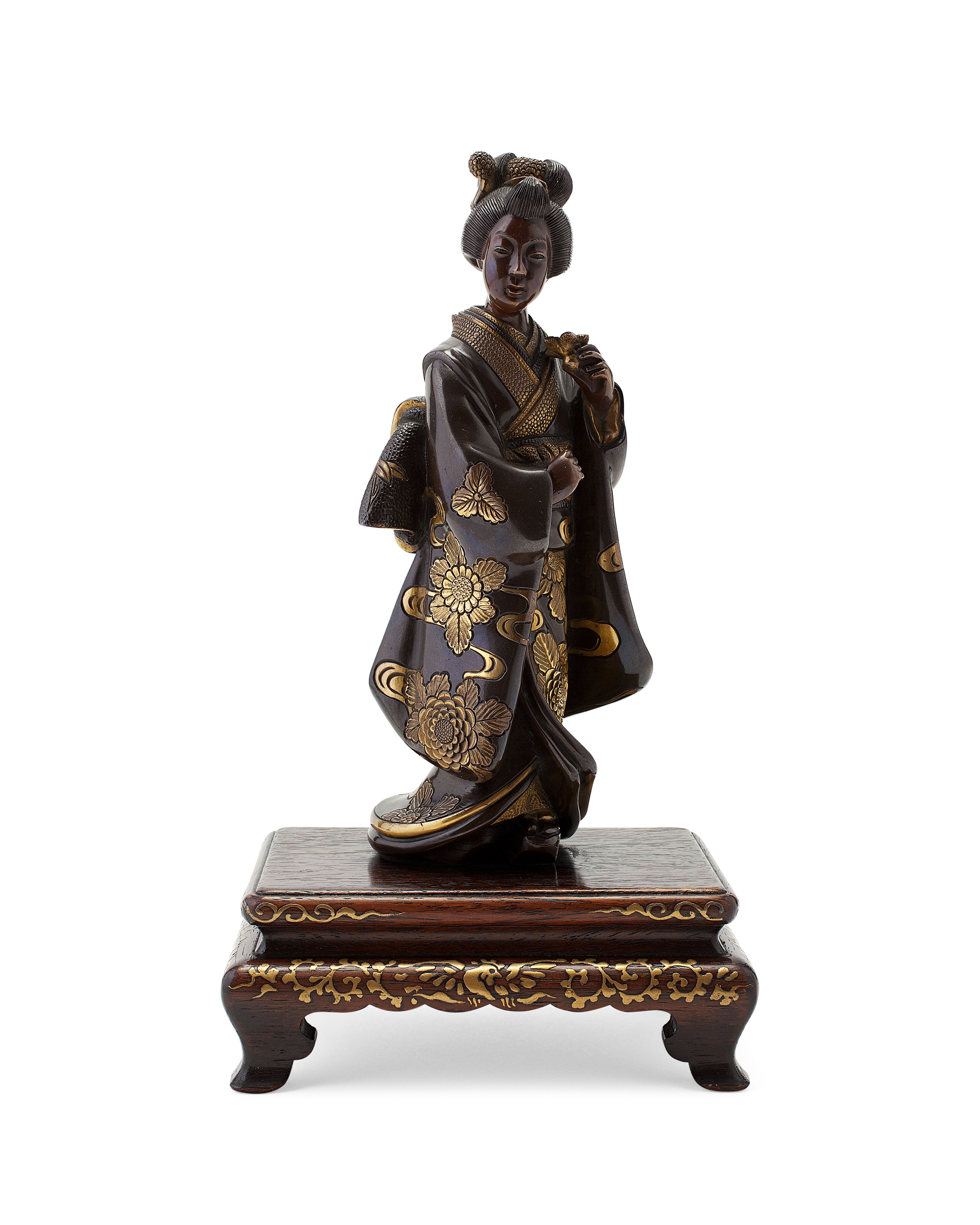 modelled as a geisha, raised on a hardwood stand with gilt lacquer decoration, signature to reverse