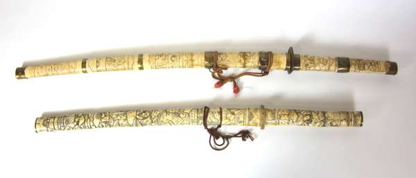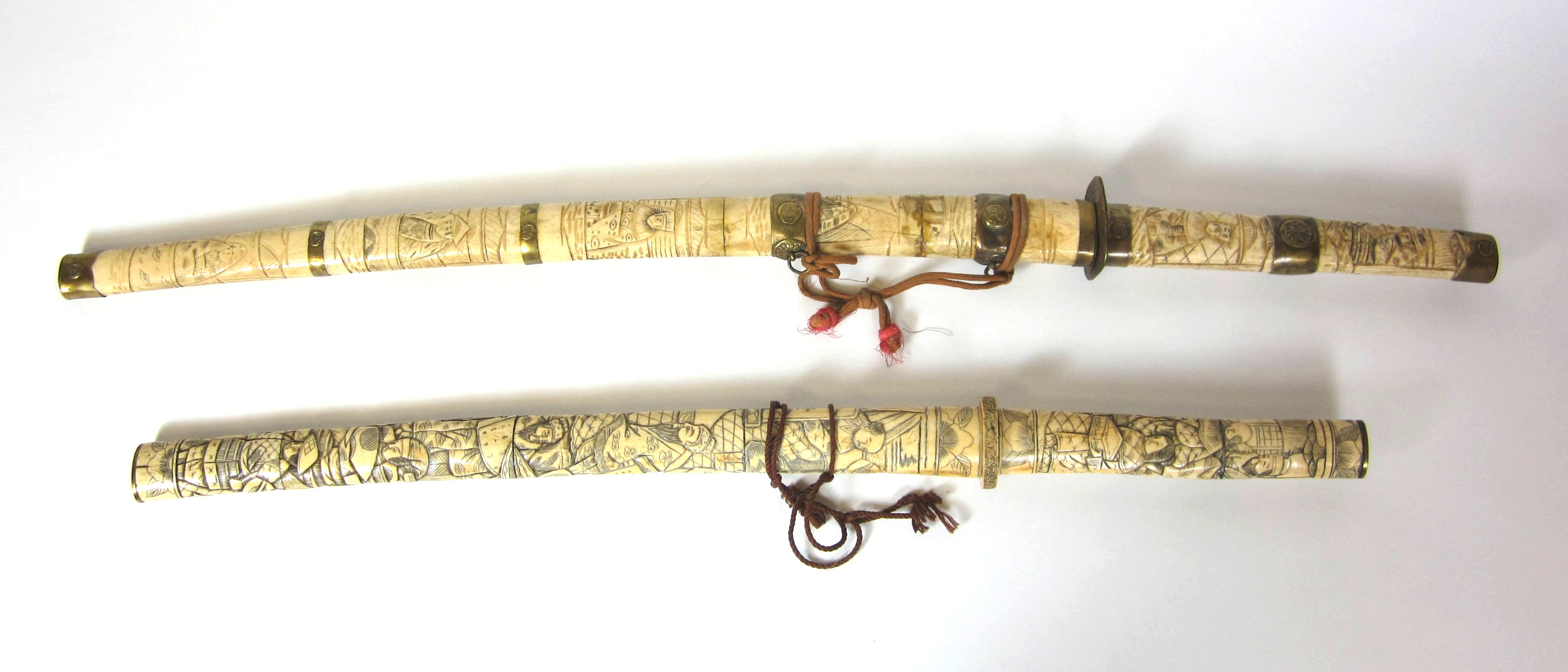 with bone grips and scabbards, brass mounted; together with TWO JAPANESE CARVED BONE WAKING STICKS (4)