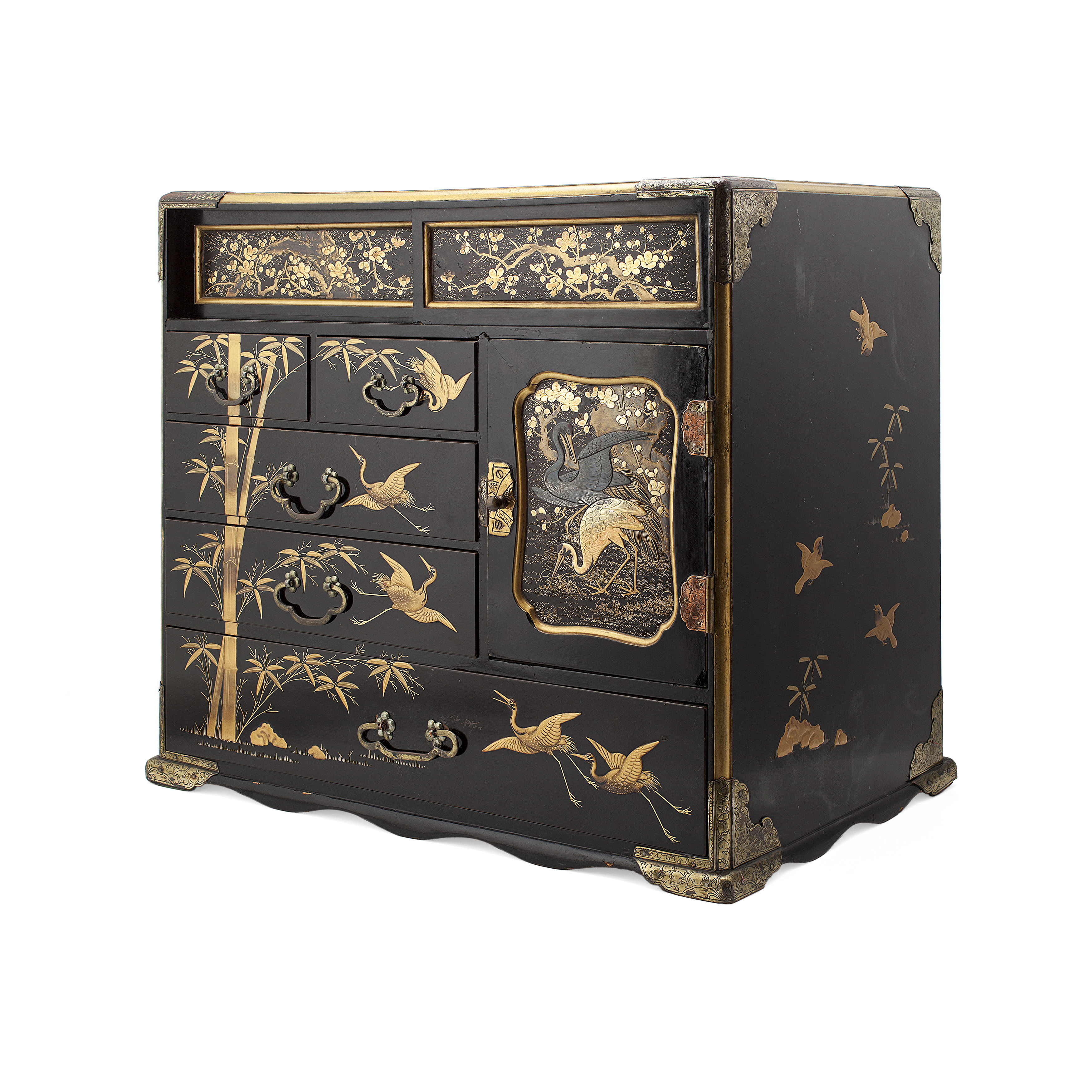 the rectangular cabinet fitted with an arrangement of drawers, sliding doors and a door, decorated in gilt with exotic birds, cherry blossoms and bamboo