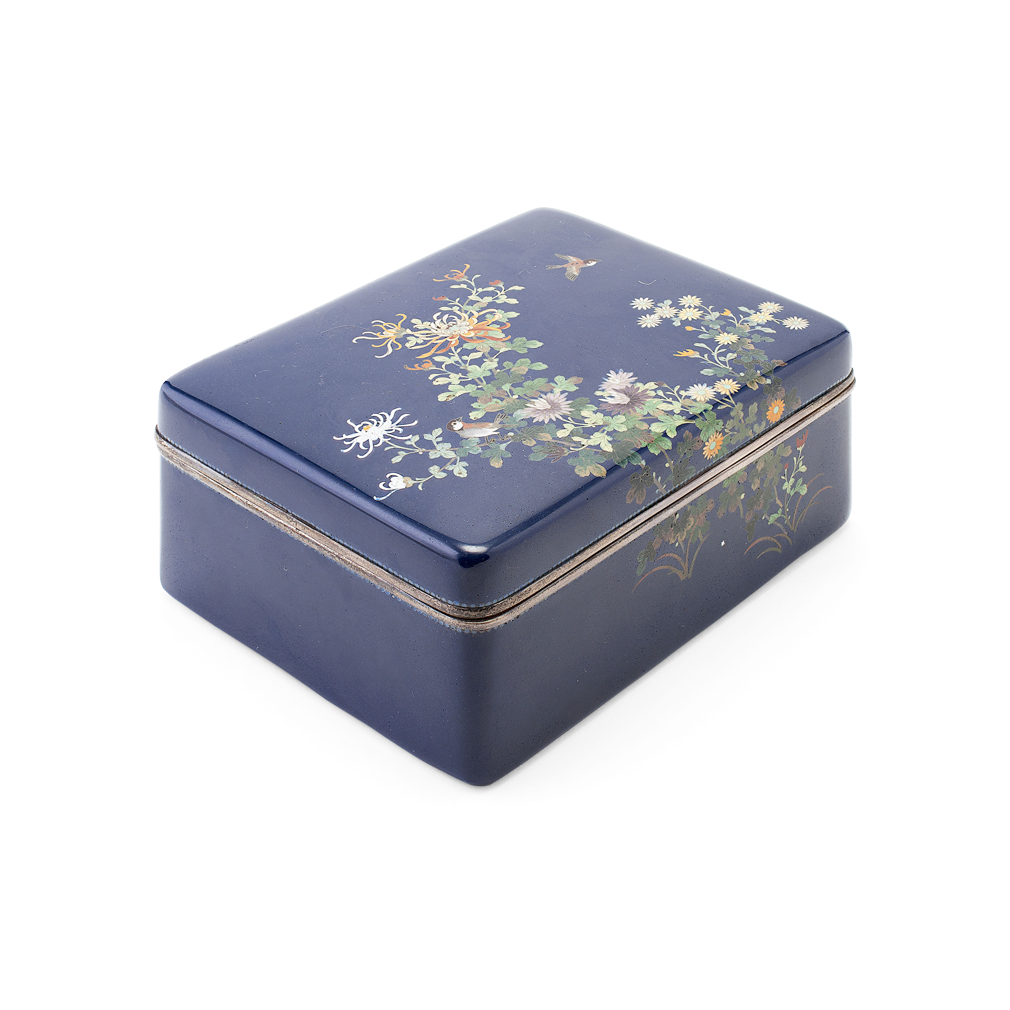 the covere and sides decorated in brightly coloured enamels with birds amongst blossoming shrubs, against a blue ground, impressed Ando silver rim mark