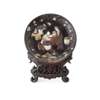 richly decorated with inlaid soapstone and mother of pearl, depicting a seated scholar and attendant, surrounded by treasured objects, the rim decorated with flowers and butterflies, with wood stand