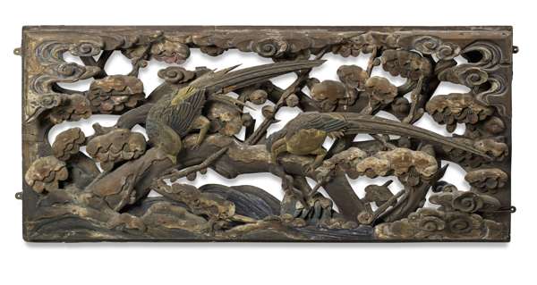 LARGE CHINESE CARVED POLYCHROMED PANEL