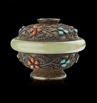 CHINESE JADE, TURQUOISE AND CORAL MOUNTED SILVER GILT CUP AND COVER