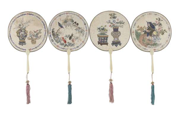 GROUP OF FOUR CHINESE PAINTED SILK AND IVORY FANS