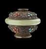 of flattened globular form, the domed cover above a jade banded rim and with foliate filigree decoration set with turquoise and coral petals, on a flared foot