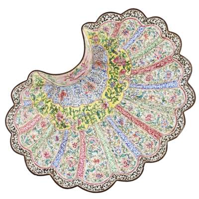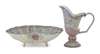 the shell form ewer and basin decorated in polychrome with bands of brightly coloured flowers and foliage