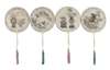 each with a circular silk panel, two decorated with exotic birds and fish, the other two with flowering urns and baskets, mounted on flattened ivory handles with silk tassles (4)