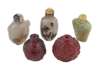 comprising two agate flattened oval examples, one with mask handles, the other carved with ducks; a jade flattened high shoulder example; and two glass examples without stoppers, one with a chilong the other with a crane (5)
