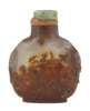 of flattened ovoid form, the stem with shaded brown, russet and red inclusions, with faux handles carved in the form of mythical beasts