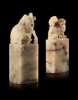in the form of a bixie with cub, the seal reads 'This is where the busy man finds pleasure', 7.8cm high; together with a CHINESE QINGTIAN SOAPSTONE SEAL, 18th / 19th century, the knob carved with rams, the base uncarved, 7.5cm high (2)